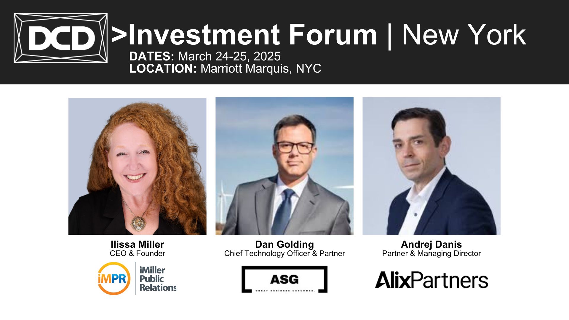 New York – March 19, 2025 – iMiller Public Relations (iMPR), a leading public relations firm for the global digital infrastructure industry, announces today that CEO and Founder Ilissa Miller will be the moderator of the Keynote Fireside chat at the upcoming DCD>Investment Forum | New York. The event takes place March 24-25, 2025, in New York City. The conference gathers data center professionals, thought leaders, and technology experts to discuss the future of data center management, infrastructure, and sustainability.