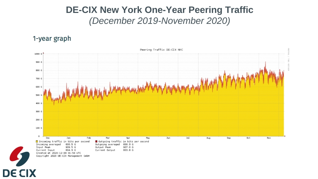 The global pandemic has significantly accelerated the growth of data traffic worldwide. This is particularly evident at DE-CIX New York, the metro market’s largest neutral Internet Exchange in terms of connected networks. In 2020, DE-CIX New York’s peak traffic increased by 50% from December 2019 with measured peaks below 600Gbps to November 2020 with measured peaks just over 900Gbps, marking the largest increase in peak traffic within a single year since DE-CIX New York launched in 2014.